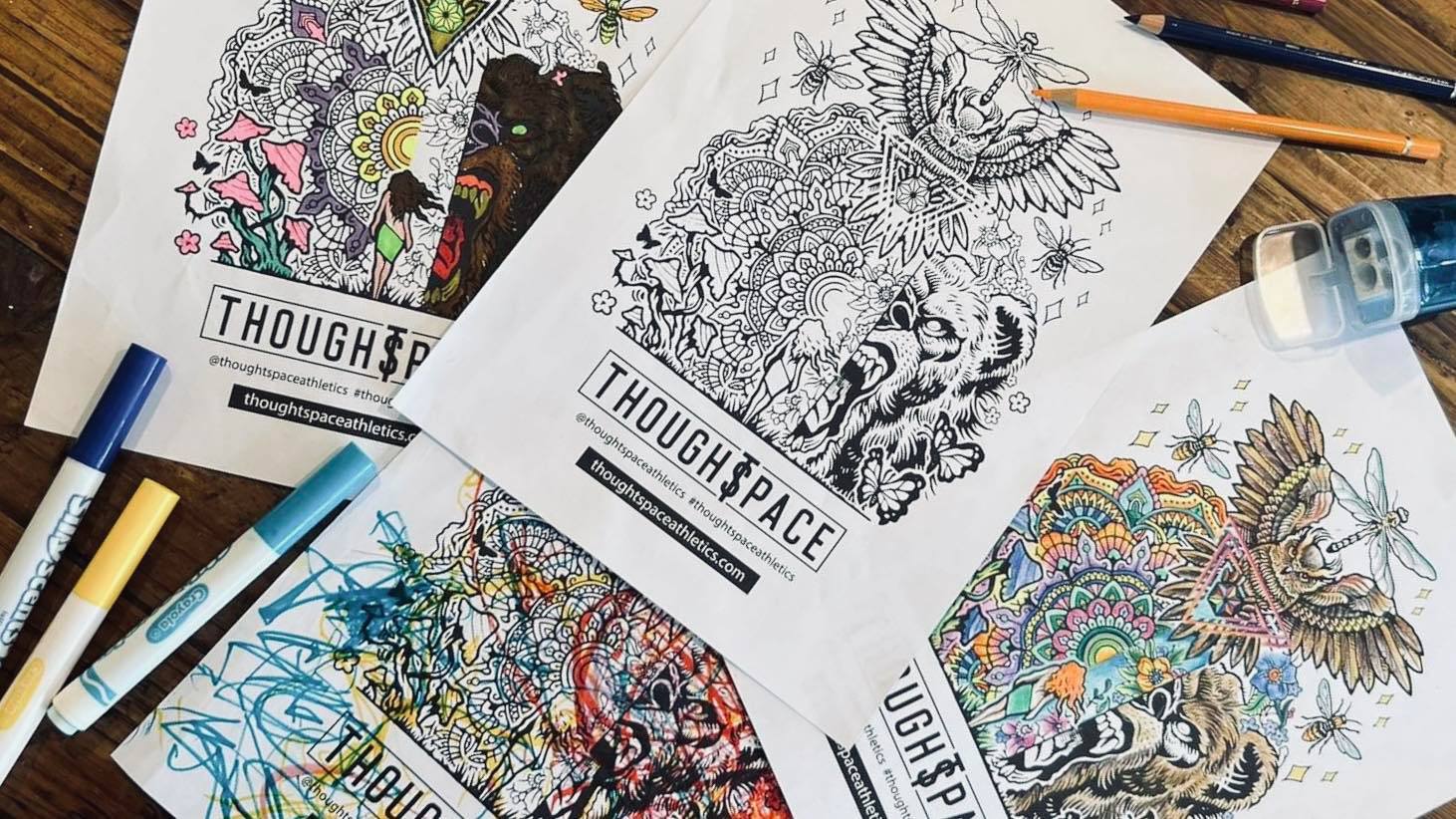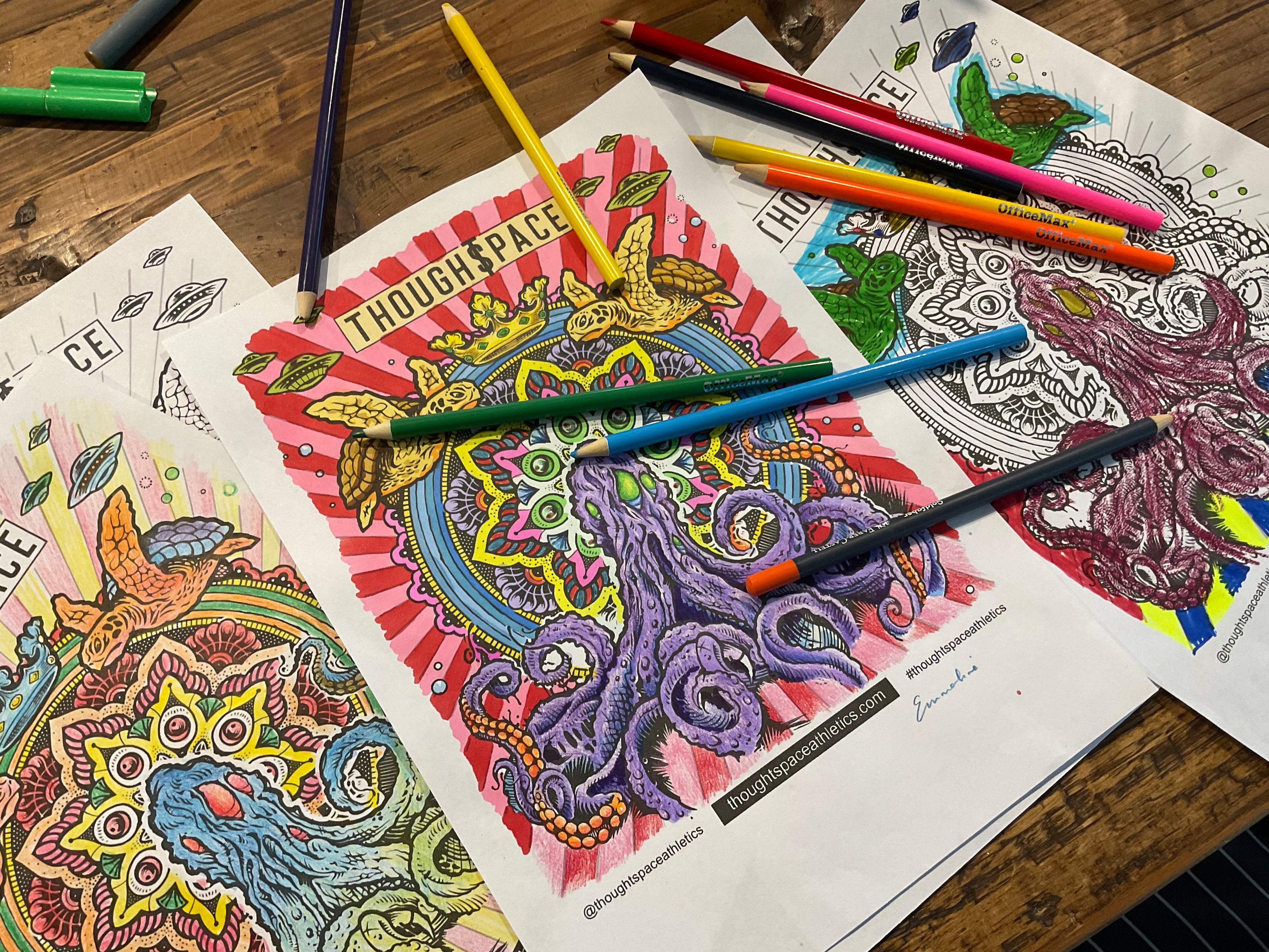 Download our fun Thought Space Athletics coloring pages featuring mash-ups of some of our favourite designs. Share your finished creations with us on social media #thoughtspaceathletics