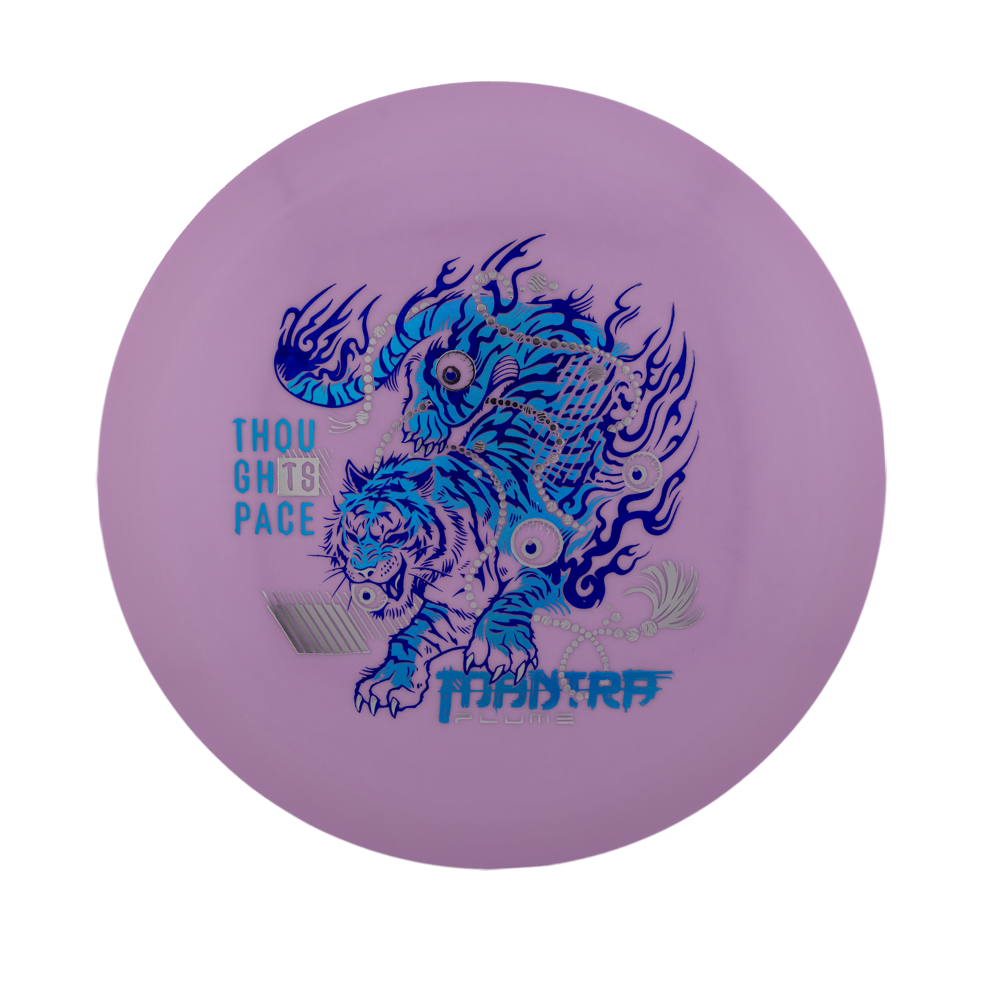 This run showcases a powerful tiger design that embodies agility, focus, and the constant push for balance on the course. With its body coiled in motion and flames trailing behind, the tiger captures the Mantra’s essence. A disc that blends smooth control with just the right touch of wild, free-flowing energy.